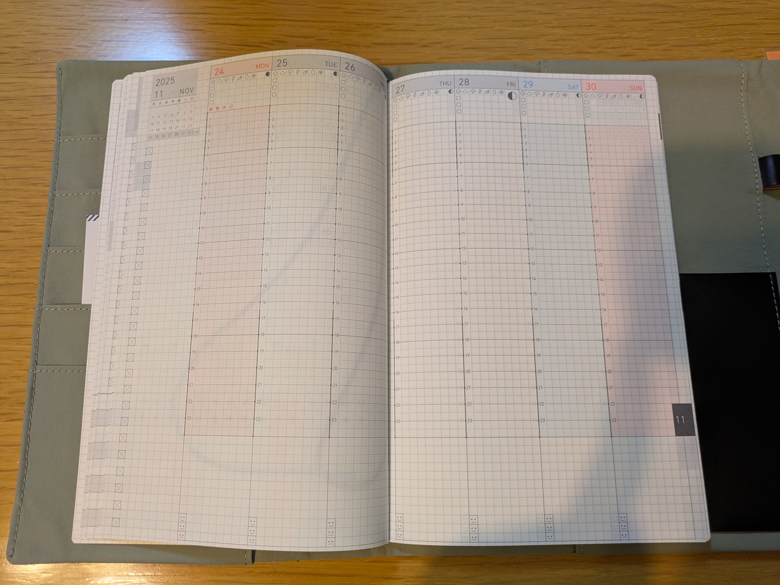 SUNNY手帳を買った時は「自分は時間軸で管理するほど予定もないし、毎日小さなタスクができればいいな」と思っていました。なので時間軸がなく、午前と午後と夜ぐらいに緩く分けられるセミバーチカルが良さそうだなと思って買っていました。