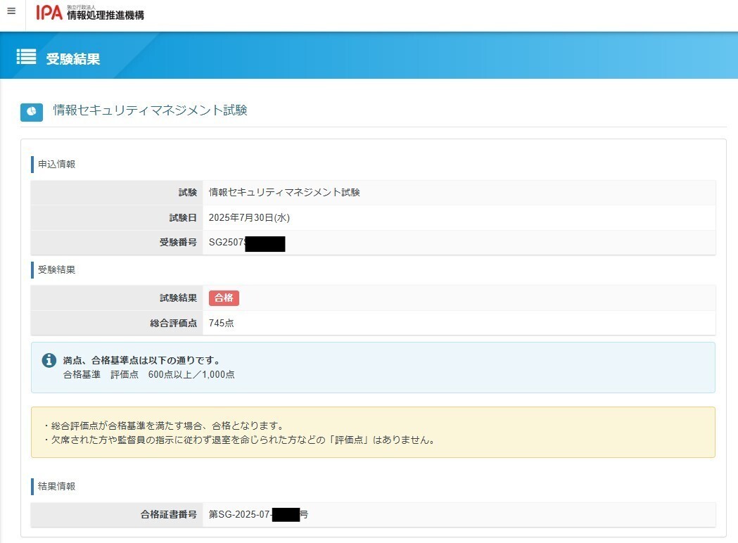 その結果、5ヶ月くらいちまちま勉強して、情報セキュリティマネジメント試験に合格できました!🎉