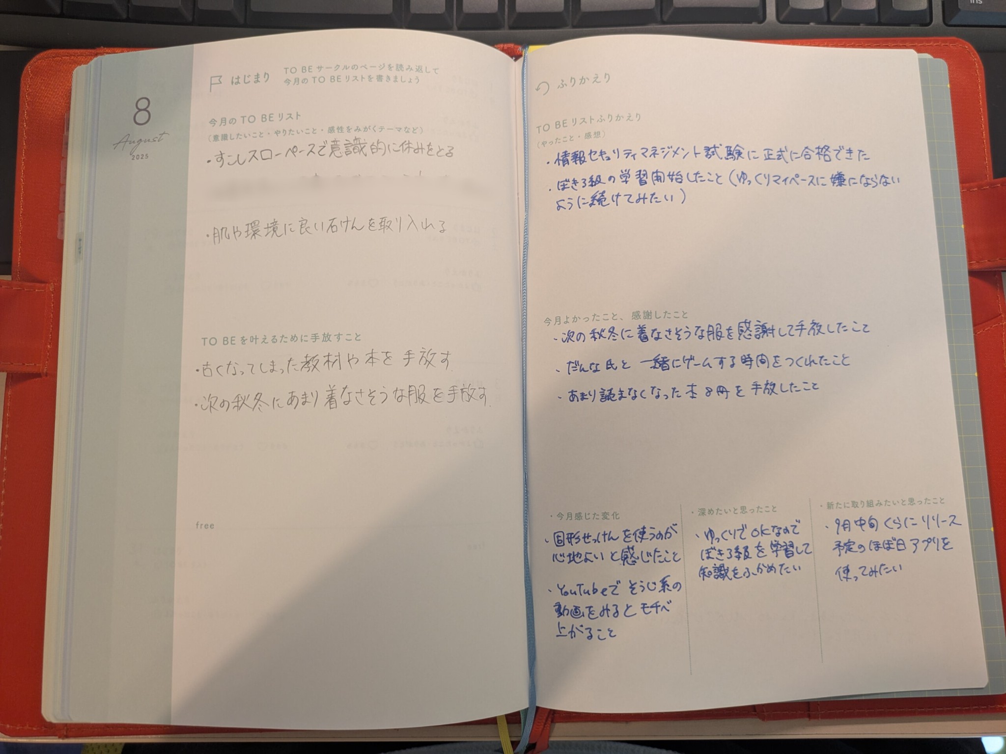 Notionの自作テンプレートでの記録と併用しながら、気分が乗ってる日や時間がある日は手書きで記録しています。