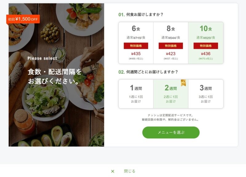 冷凍庫のスペースが十分にある場合、noshの10食プラン以上を選ぶことで、1食あたりのコストを下げることができます。例えば、初回の注文で選択できるプランでは、6食プランの1食あたりの値段が719円(税込)なのに対し、10食プランでは620円(税込)と、約100円もお得になります。