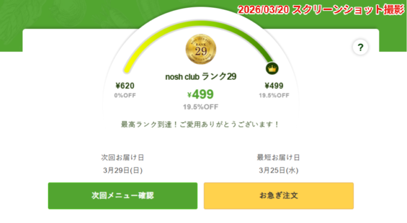 さらに、noshには「nosh club」という累計の購入数によって、割引になる制度があります。筆者はnosh clubランク29(累計購入数280食以上、割引率19.5%)です。