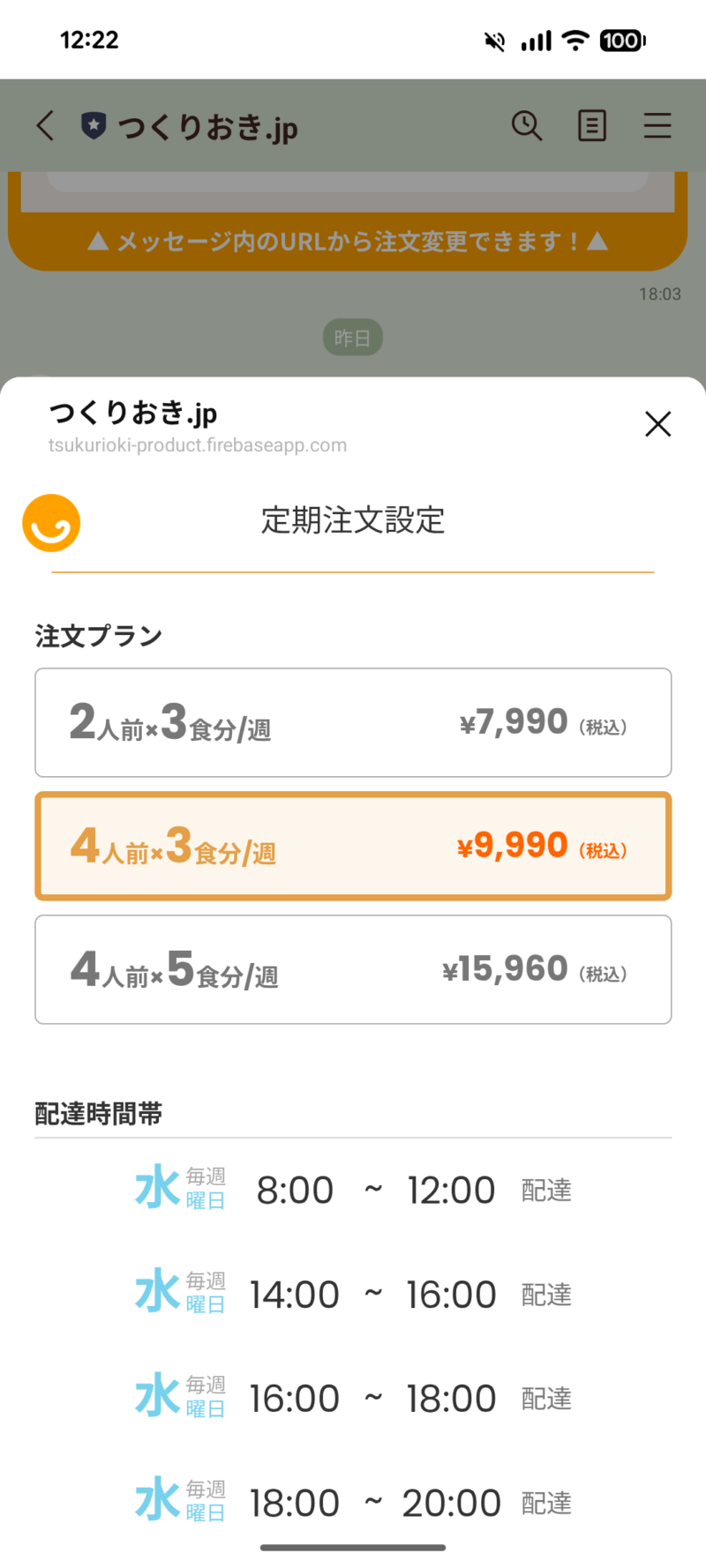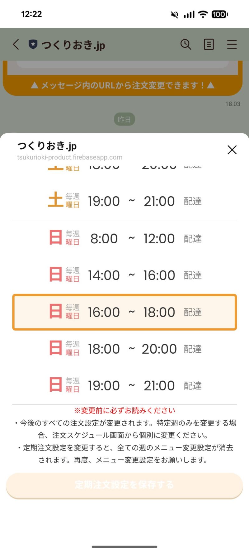私たちの場合は毎週日曜日、16:00~18:00の時間帯に配達してもらうように設定しています。